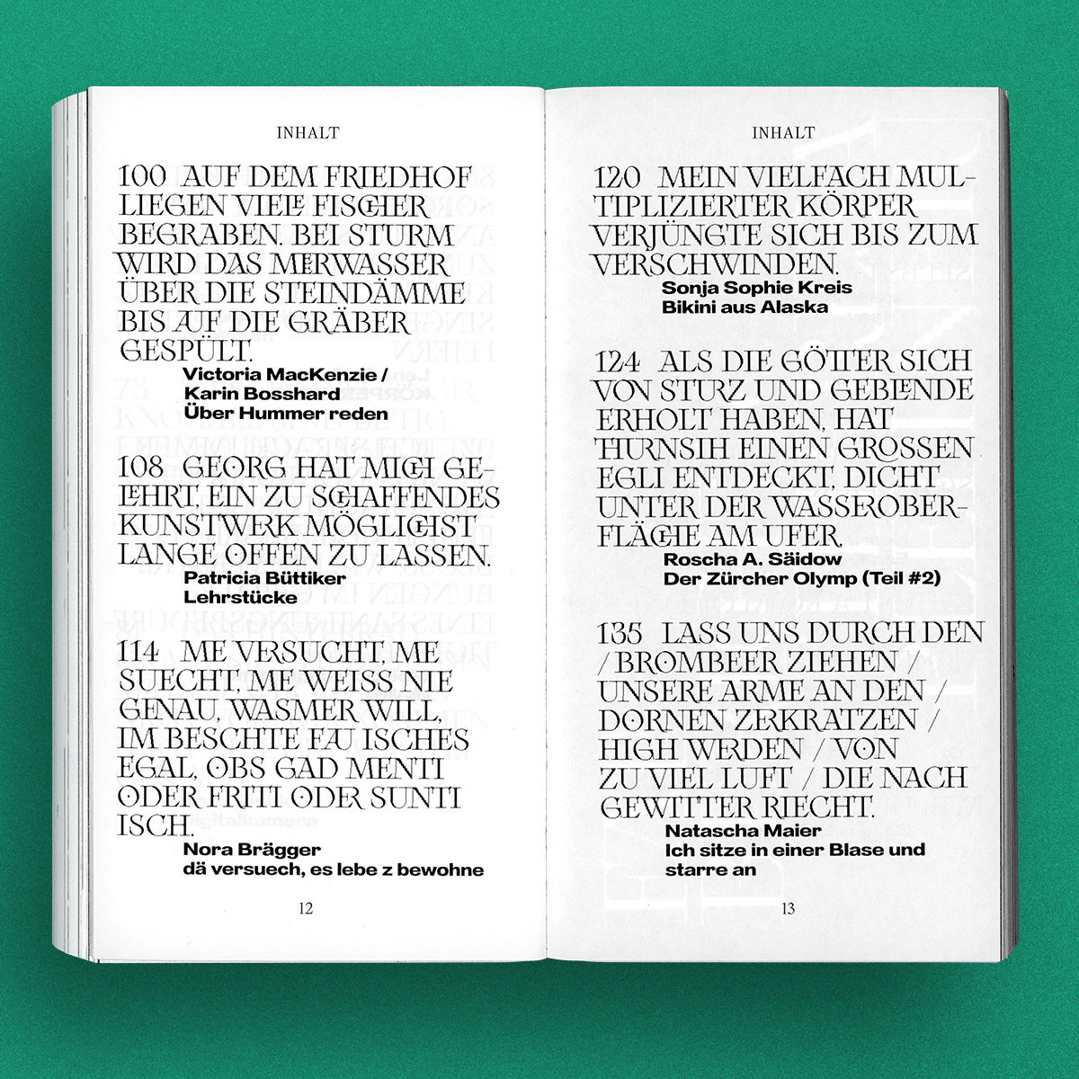 Das Narr #31 brings together texts by FLINTA writers. Prompted by an essay by Isabelle Lehn on the marginalisation of female voices in literature, the open call was directed at women, lesbians, inter, non-binary and trans authors. 106 submissions reached us. We read, discussed, argued—and are now happy to present those texts that stayed with us. As with the writing, all typefaces and illustrations in this issue were created by FLINTA artists. With texts by AX, Karin Bosshard, Nora Brägger, Patricia Büttiker, Jchj V. Dussel, Samira El-Maawi, Asa Hendry, Johanna Hühn, Nesrin Kaya, Darja Keller, Sonja Sophie Kreis, Marie Kublik, Isabelle Lehn, Victoria MacKenzie, Natascha Maier, Theresa Pleitner, Lena Reißner, Rosa Rieck, Gianna Rovere, Roscha A. Säidow and Maë Schwinghammer.